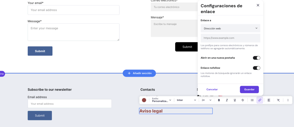 Para mostrar enlaces a tus páginas legales en el pie de página, vuelve a la página de inicio y desplázate hasta la sección inferior.