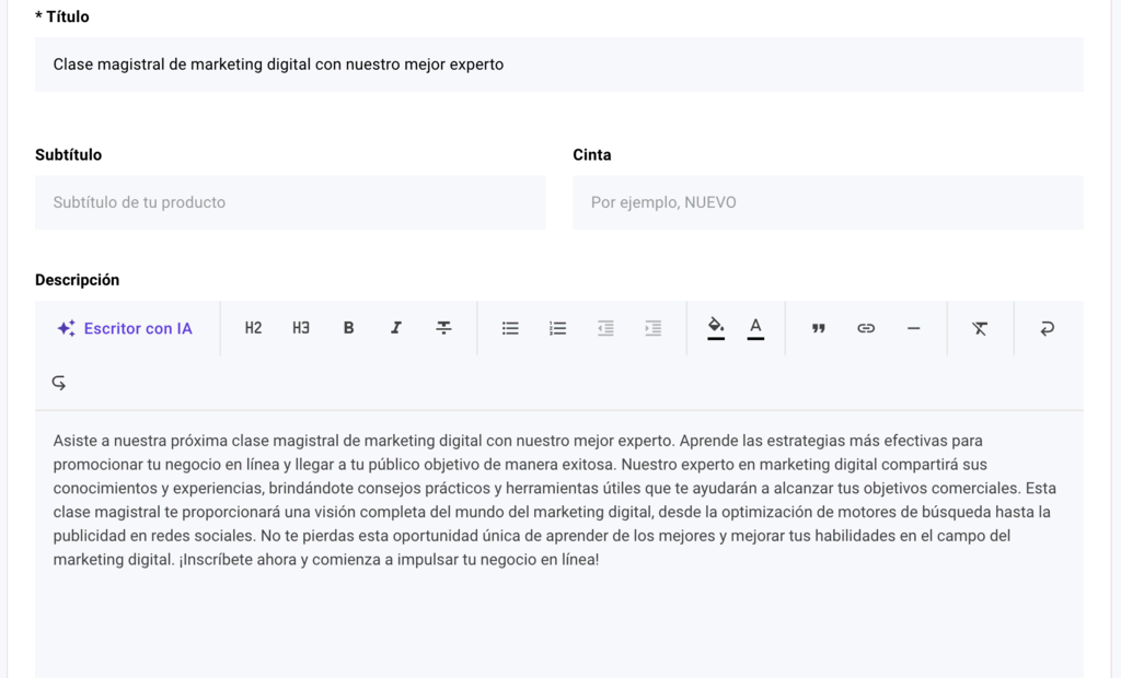 - Crea un título claro y descriptivo con detalles esenciales como el tipo de servicio, la duración y cualquier propuesta de venta única. Por ejemplo, “Clase magistral de marketing digital con nuestro mejor experto”.