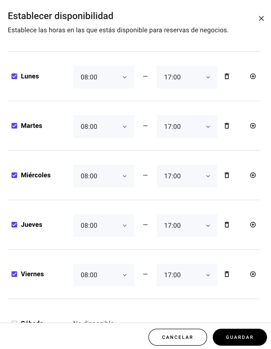 - Vuelve a comprobar los ajustes de disponibilidad que hayas configurado previamente para tu sistema de reservas online. Asegúrate de que tus días y horas laborables son correctos.