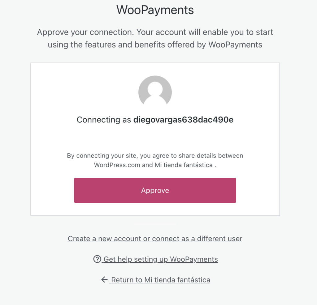 - WooCommerce te enviará por correo electrónico un enlace para conectar tu tienda online con WooPayments. Haz clic en él para continuar con el proceso de configuración.