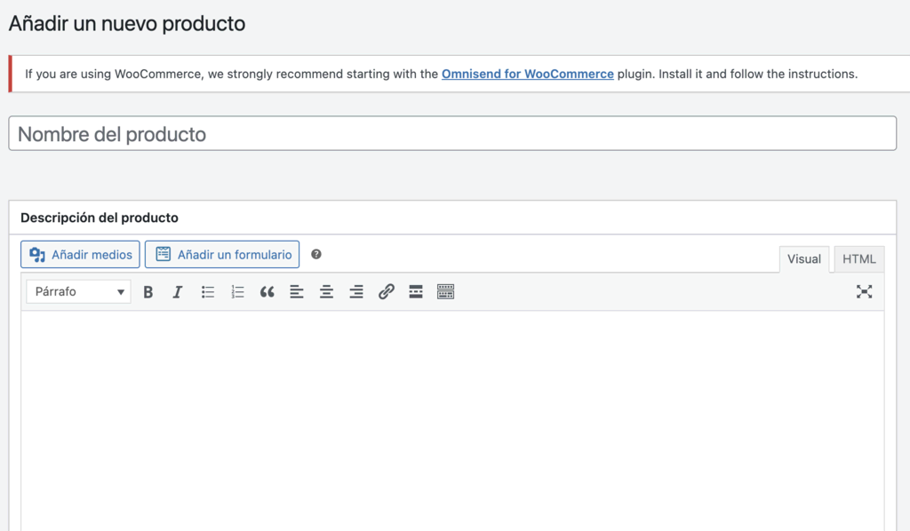 - Ve a Productos → Añadir nuevo desde el panel de control de WordPress.