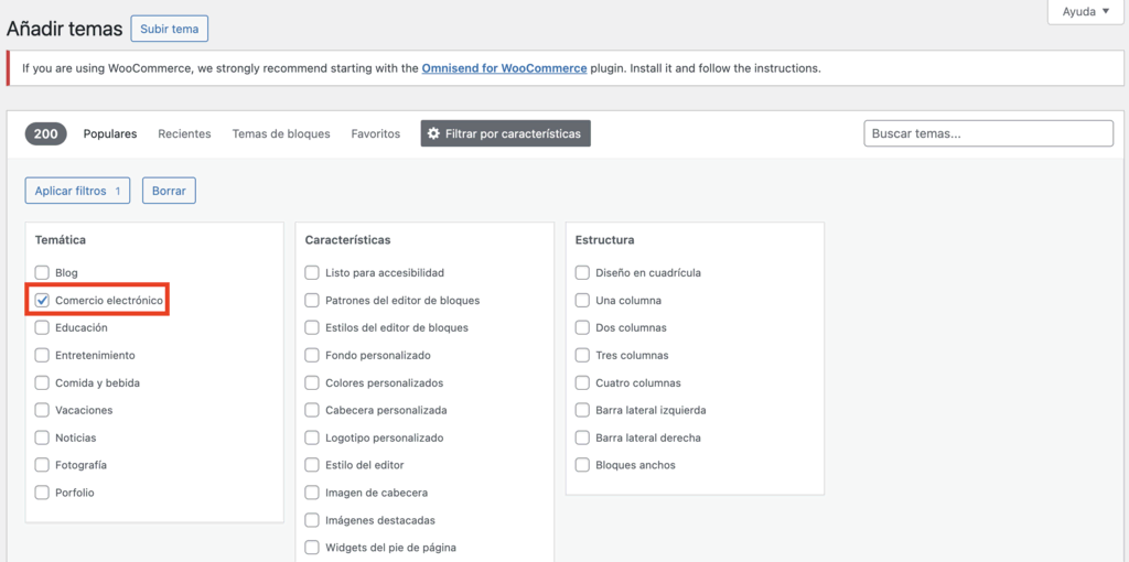- Haz clic en Filtrar por características y selecciona Comercio electrónico en Temática para mostrar sólo temas de comercio electrónico en los resultados de la búsqueda. Pulsa Aplicar filtros para confirmar tu elección.