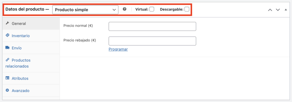 - Producto simple: cubre los artículos que se venden individualmente, como una lámpara. Marca la opción Virtual si es intangible o Descargable para conceder acceso al archivo tras la compra.