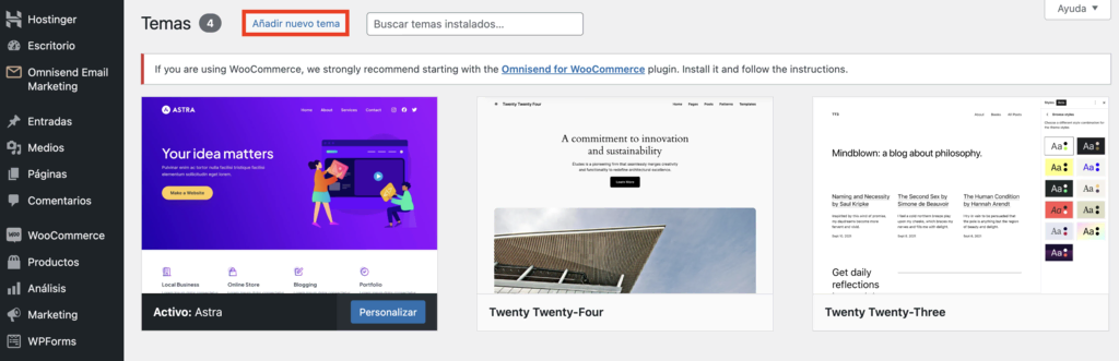 - Instala y activa el tema de WordPress que mejor se adapte a tu tienda online.