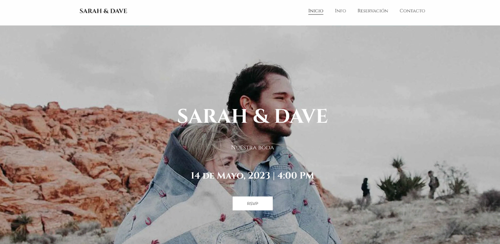 - Página de inicio: agrega los detalles más importantes de la boda e indica a tus invitados que reserven la fecha.