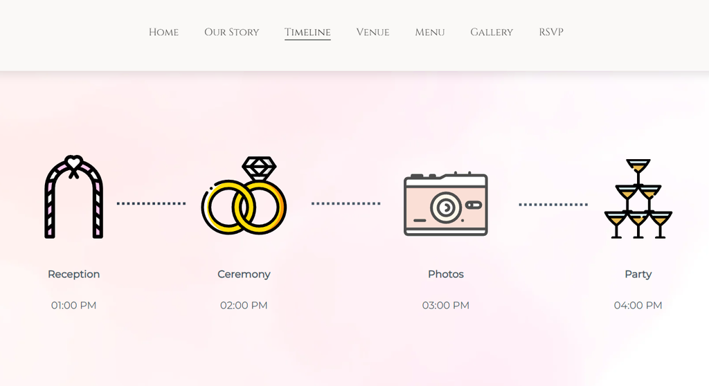 Una cuenta atrás es una forma estupenda de crear expectativa y animar a los invitados a confirmar su asistencia y marcar la fecha en sus calendarios. Incorporar un temporizador de cuenta atrás en la página web de tu boda añade una sensación de urgencia y mantiene viva la emoción.