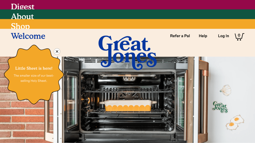 El sitio de Great Jones es un excelente ejemplo de esta práctica. Utiliza Cooper Black para el logotipo y los titulares, mientras que Hope Sans se reserva para los subtítulos, los enlaces y las citas.