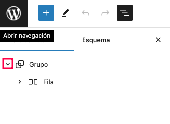 En este ejemplo, utilizamos el tema de bloques Twenty Twenty-Four, que utiliza un grupo de bloques en el header predeterminado. Si tu plantilla elegida también la usa, al hacer clic en la flecha se mostrarán todos los bloques agrupados.