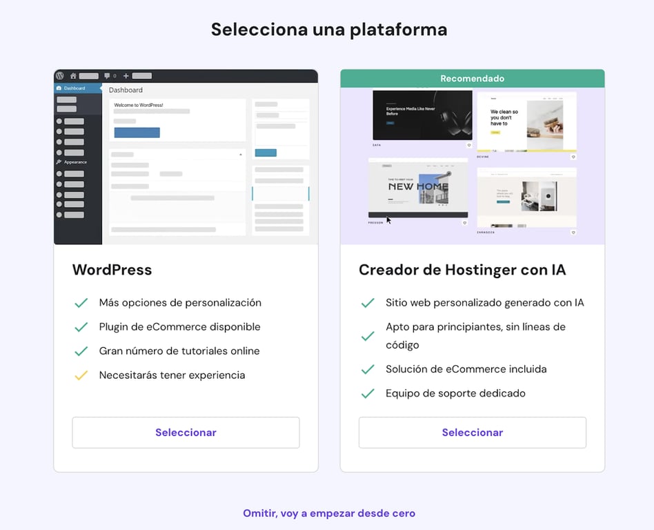 Configurar un sitio web de WordPress es más complicado que utilizar el Creador de Sitios Web de Hostinger. Es por ello que simplificamos este proceso con un instalador de un solo clic y un flujo de incorporación optimizado en nuestros planes de alojamiento gestionado de WordPress.
