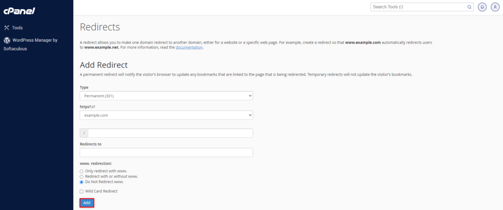 Los usuarios de cPanel pueden redirigir URLs no www a www a través de la configuración de Redirección o editando el archivo .htaccess.