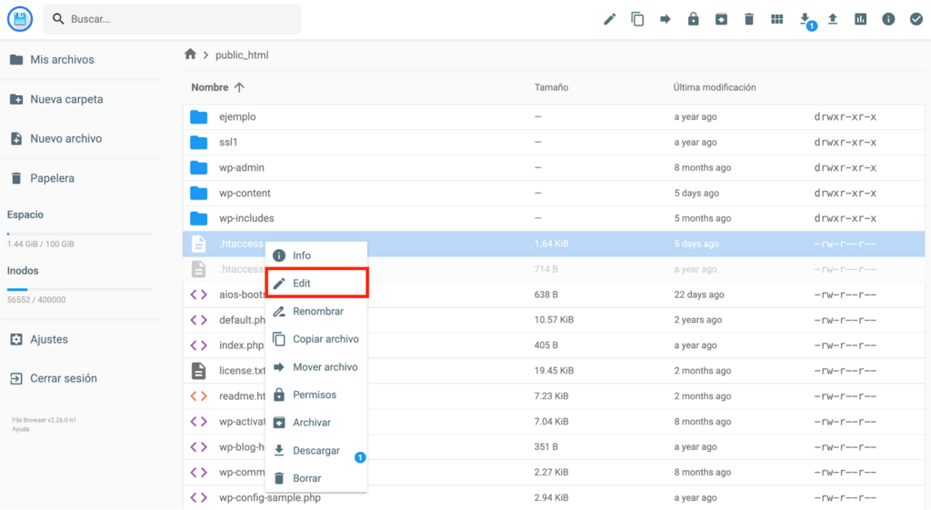 - Haz clic con el botón derecho en el archivo .htaccess y selecciona Editar.