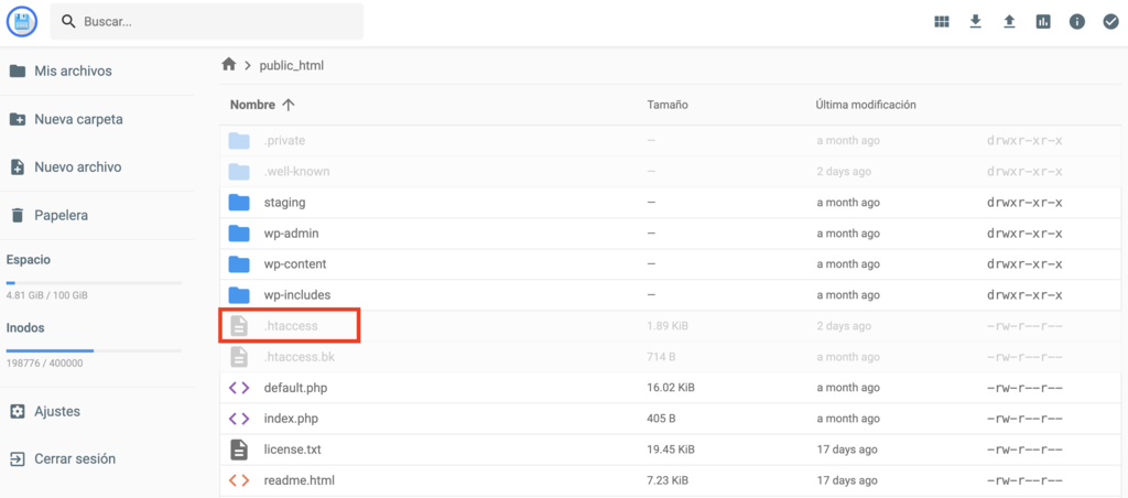 - Haz doble clic en la carpeta public_html y localiza el archivo .htaccess. Recuerda que puedes crear uno nuevo si no existe.