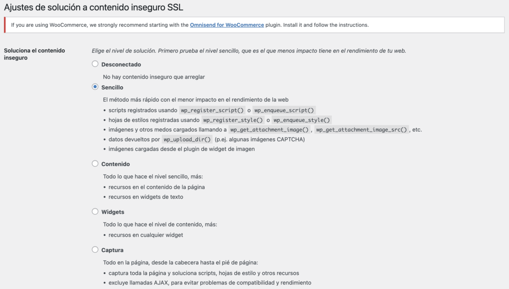 - El campo Soluciona el contenido inseguro determina el nivel de arreglo que aplicará el plugin. La opción Sencillo se centra en scripts, hojas de estilo y archivos multimedia de WordPress, lo que minimiza el impacto en el rendimiento del sitio web. Empieza aquí y escala si es necesario hasta que se resuelva la advertencia.