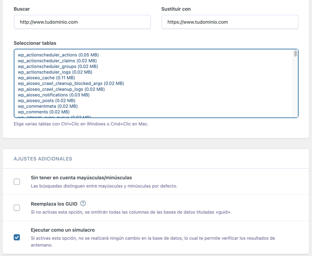 - Rellena el campo Buscar con la dirección HTTP de tu sitio web, y añade la versión HTTPS en el campo Sustituir con.