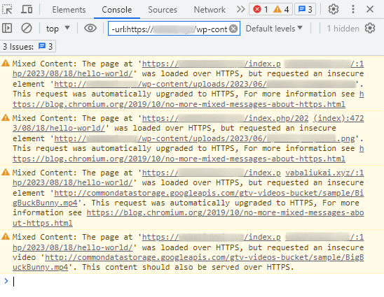 Abre la pestaña Consola en las herramientas del desarrollador para ver todo el contenido inseguro marcado de WordPress en tu sitio web.