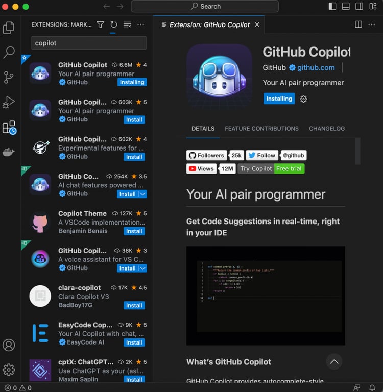 La instalación de Copilot es un proceso sencillo, independientemente de si usas Visual Studio Code, Visual Studio, Vim, Neovim o la suite de entorno de desarrollo integrado (IDE) de JetBrains. También necesitas una cuenta de GitHub. En este ejemplo instalaremos la extensión GitHub Copilot para Visual Studio Code:
