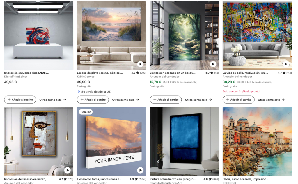 Por ejemplo, podrías observar que muchas impresiones sobre lienzo tienen un precio de entre 40 y 60 euros. Esto podría darte una idea de lo que están dispuestos a pagar los clientes del mercado de masas.