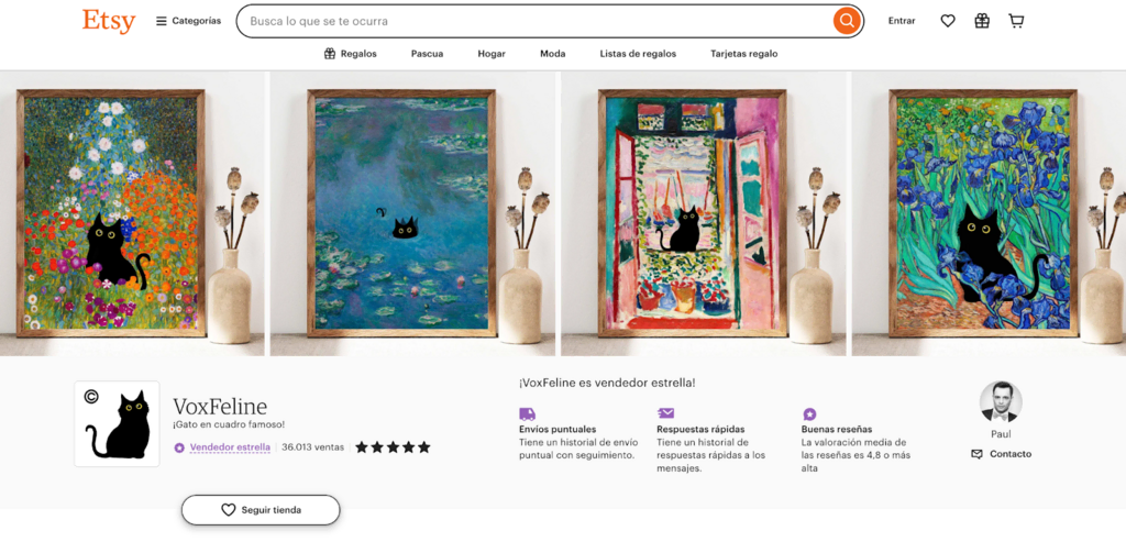 Por ejemplo, la tienda de Etsy VoxFeline vende pósters creativos de temática gatuna. Su nombre comercial habla por sí solo: