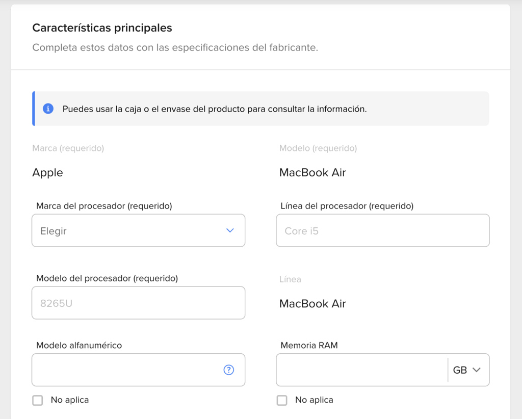 - Ahora debes rellenar las características principales del producto y establecer si es nuevo, usado o reacondicionado.