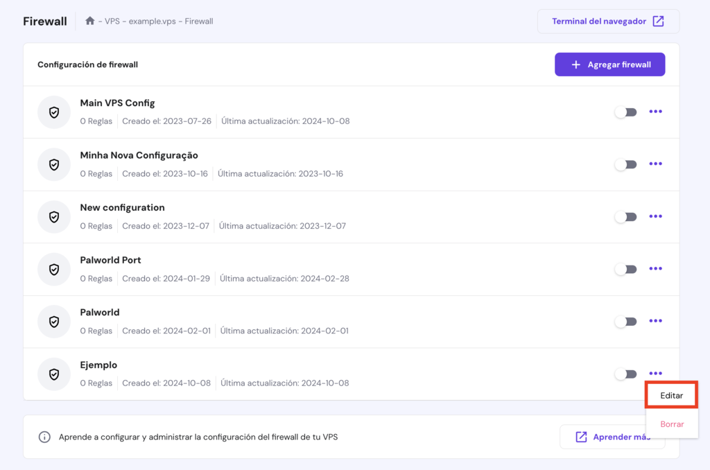Alternativamente, puedes configurar nuestro Firewall VPS Hostinger integrado. Comienza por elegir tu VPS y navegar a la sección Firewall.