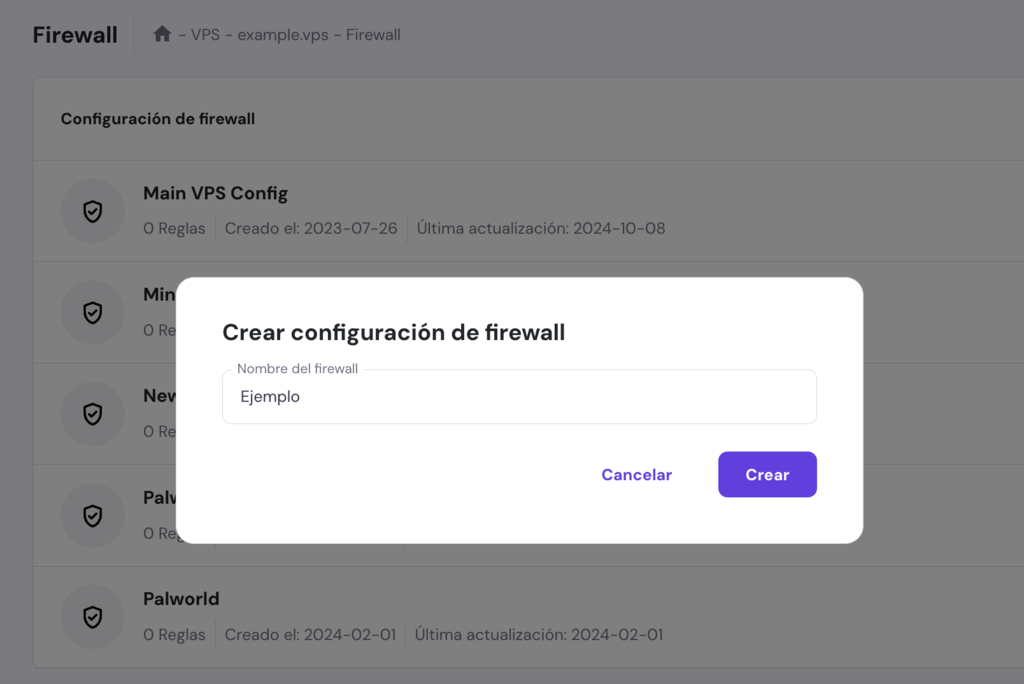 A continuación, selecciona Crear configuración de firewall y asigna un nombre a la configuración y haz clic en Crear.