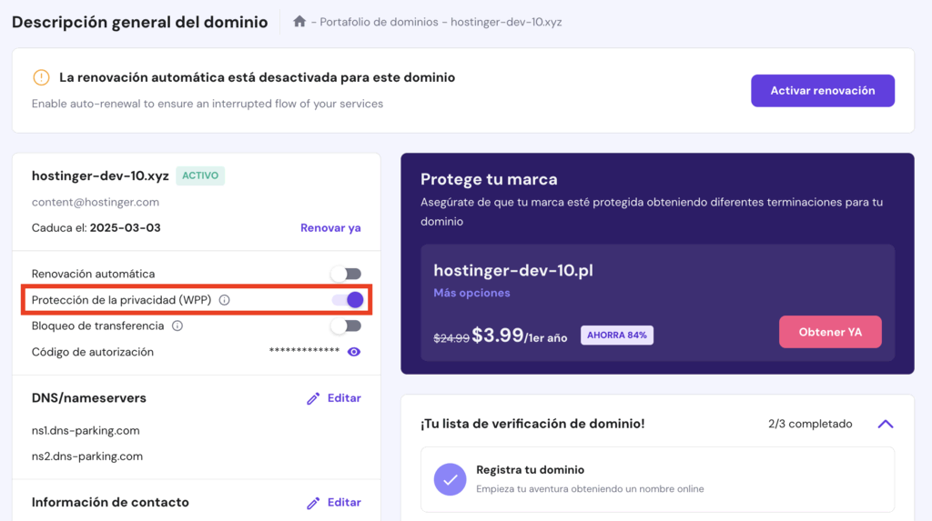 A continuación te explicamos cómo activar la protección de privacidad de dominio en Hostinger: