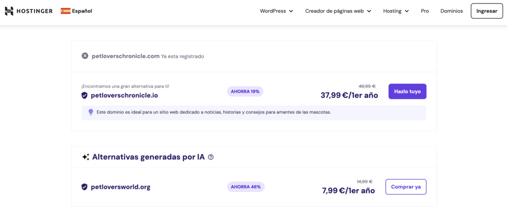 Veamos petloverschronicle.com como ejemplo. Como el nombre no está disponible, la herramienta de búsqueda de dominios te sugerirá nombres con TLD diferentes, como petloverschronicle.net.