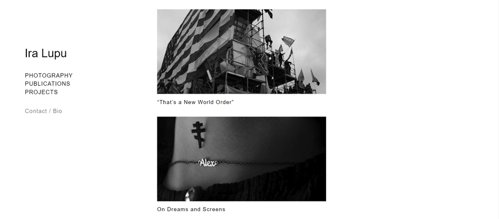El sitio web de Ira Lupu utiliza un menú de navegación lateral, que complementa el sencillo diseño de la web. Gracias al desplazamiento infinito, los visitantes pueden navegar fácilmente por todos los proyectos de Lupu directamente a través de la página de inicio.