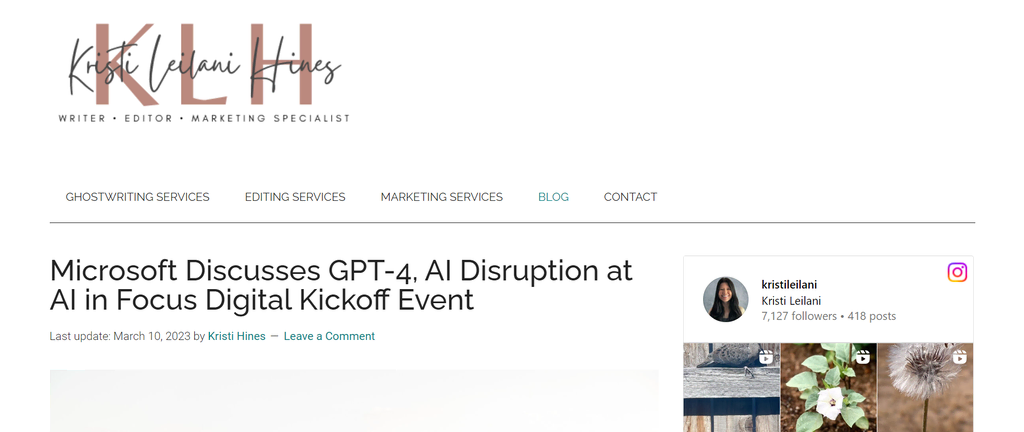 A diferencia de muchas páginas web personales de esta lista, Kristi Hines no utiliza elementos visuales ni enlaces de menú en el diseño de su cabecera.