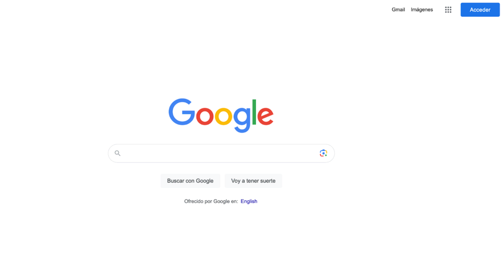 La página de inicio presenta la icónica barra de búsqueda de Google con un fondo blanco minimalista. Los enlaces a las distintas aplicaciones de Google, a la configuración de la cuenta y a los ajustes de privacidad están escondidos en las esquinas de la página, lo que favorece una experiencia sin desorden.