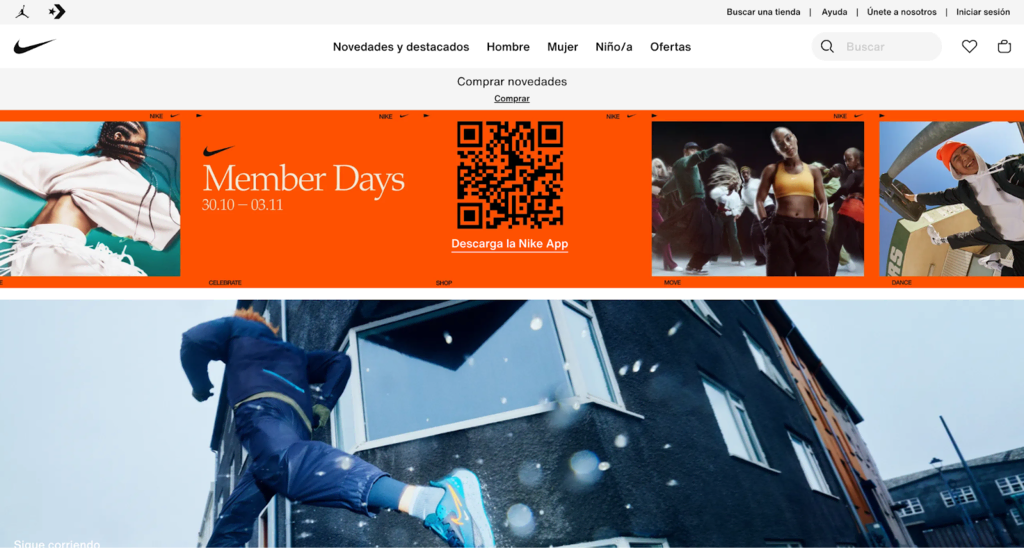 El sitio web de Nike está diseñado con un fuerte énfasis en imágenes de alta calidad y narrativas inspiradoras.