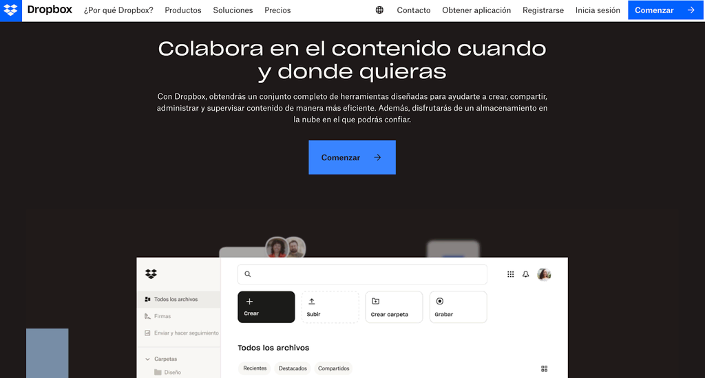 Como todos los mejores sitios web corporativos, la página de inicio presenta la gama de servicios y soluciones de Dropbox de forma fácil de entender.