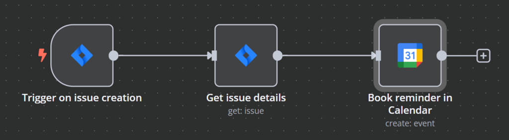 - Programar reuniones: puedes configurar un flujo de trabajo para programar reuniones en función del progreso de un proyecto. Por ejemplo, puedes configurar un activador conectado a Jira que reserve reuniones en un calendario cuando se alcancen hitos predeterminados, como el cambio de estado de una incidencia.