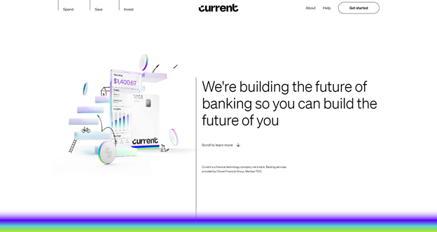 Por ejemplo, el sitio web de Current utiliza un diseño desenfadado y destaca sus productos financieros exclusivos. Esto les ayuda a diferenciarse de los bancos tradicionales y a atraer a una clientela más joven.