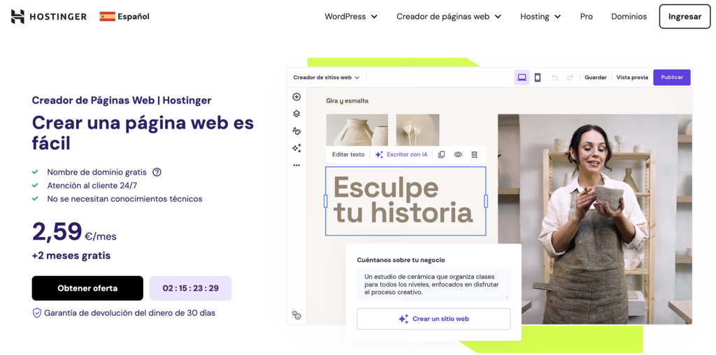 Soluciones como el Creador de sitios web de Hostinger también son una excelente opción para crear un nuevo sitio web. Garantizan que tu sitio sea compatible con dispositivos móviles sin necesidad de modificar configuraciones o códigos técnicos complicados.