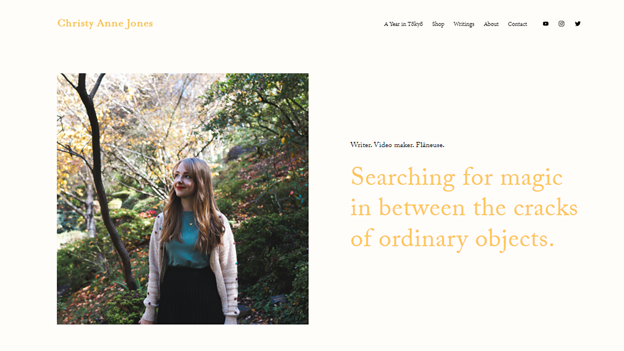 Su sitio web, minimalista y atractivo, luce una sencilla combinación de colores en blanco, dorado, negro y verde azulado oscuro, con contrastes para que el texto sea legible. También utiliza la fuente Serif que le da un aire clásico. La abundancia de espacio en blanco también hace que destaquen las pocas palabras y fotos que aparecen.