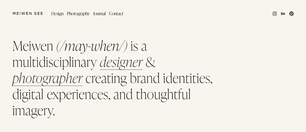 Meiwen See es una página web minimalista de Meiwen Wang, diseñadora y fotógrafa que vive en Los Ángeles. Entre los proyectos en los que ha trabajado se incluyen fotografía de interiores y arquitectura, bodas, menús de restaurantes y branding de hoteles.
