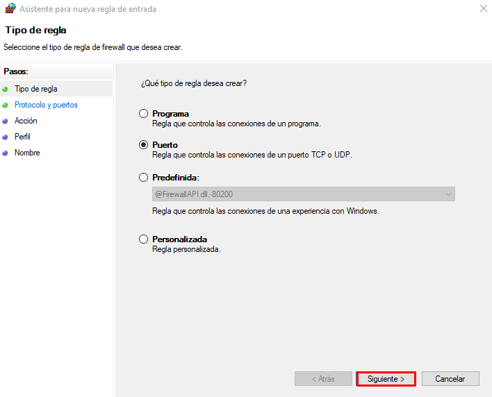- Se abrirá la ventana Asistente para nueva regla de entrada. Selecciona Puerto y haz clic en Siguiente.