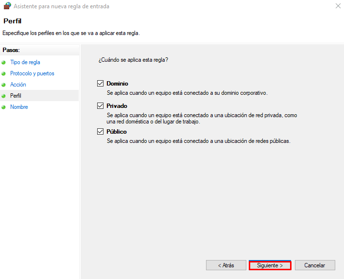 - Marca todos los perfiles Dominio, Privado y Público y haz clic en Siguiente.