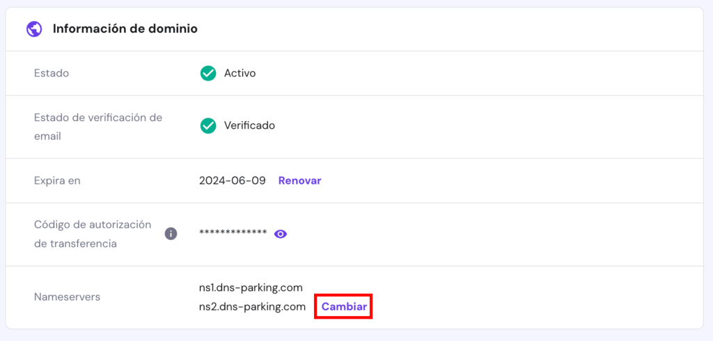 - En Información de dominio, junto a tus Nameservers, selecciona Cambiar.