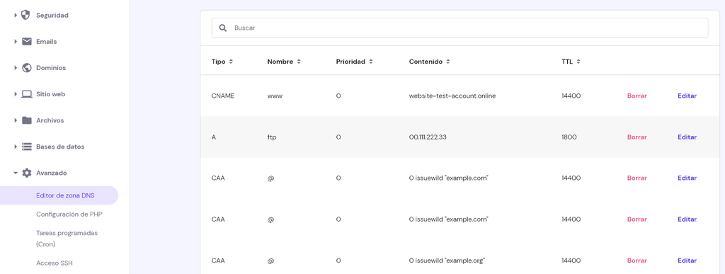 Debajo hay una tabla de los registros existentes. Utiliza la barra de búsqueda para encontrar el archivo de zona DNS exacto que estás buscando y luego borra o modifica un registro existente seleccionando Editar.