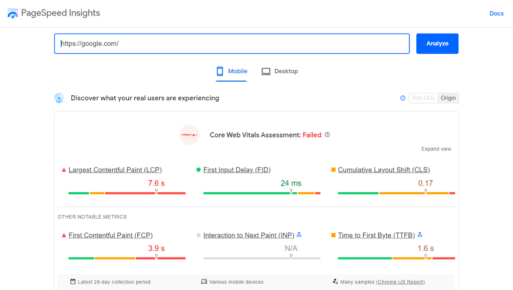 - Google PageSpeed Insights: esta herramienta analiza exhaustivamente diferentes métricas de rendimiento del sitio web y diagnostica problemas. Lo mejor de todo es que Google PageSpeed Insights es completamente gratis.