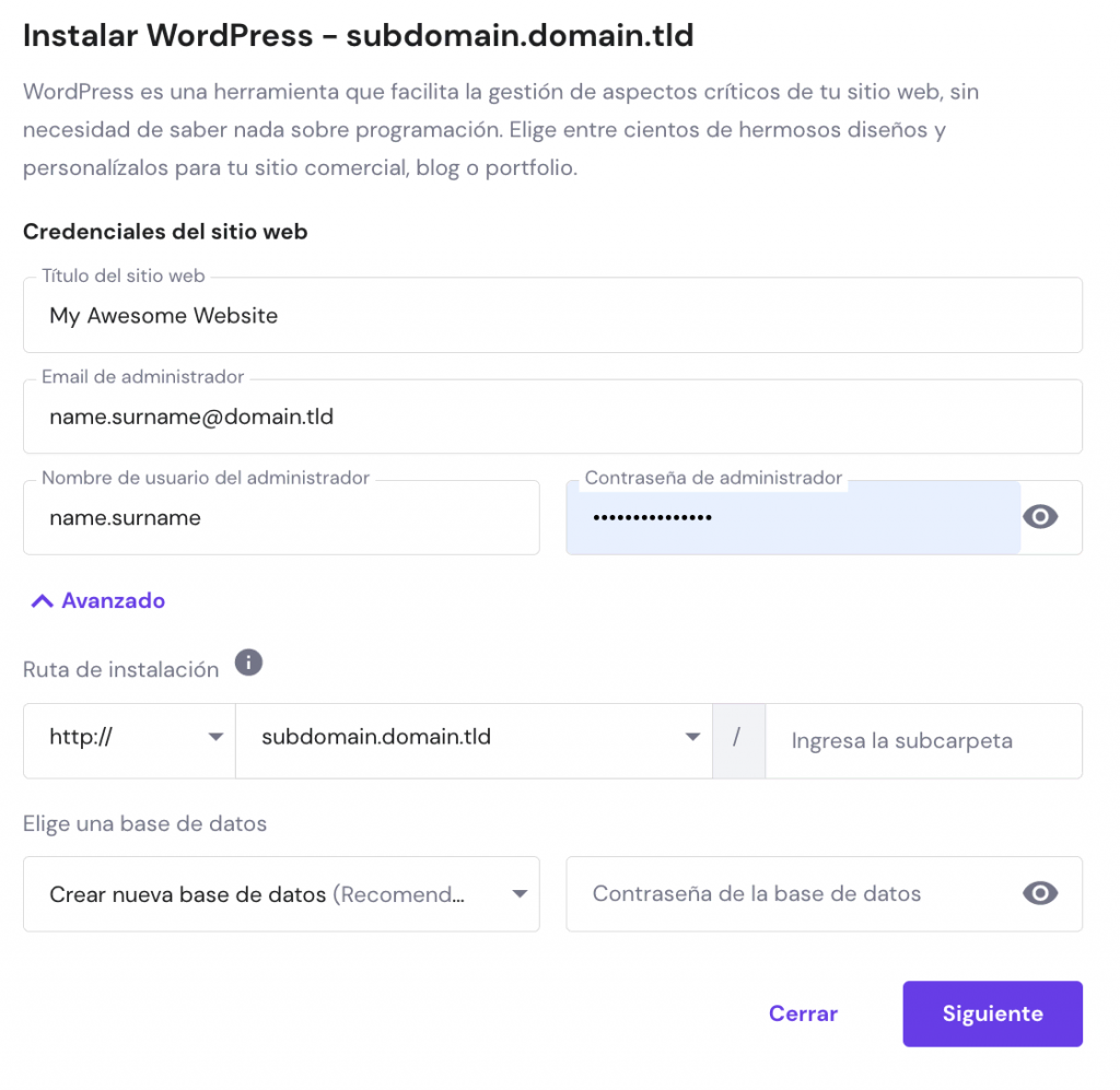 - Una vez rellenado el formulario, haz clic en Siguiente. Esto puede tardar unos minutos y tu subdominio debería aparecer en la lista de aplicaciones instaladas en el panel del autoinstalador.