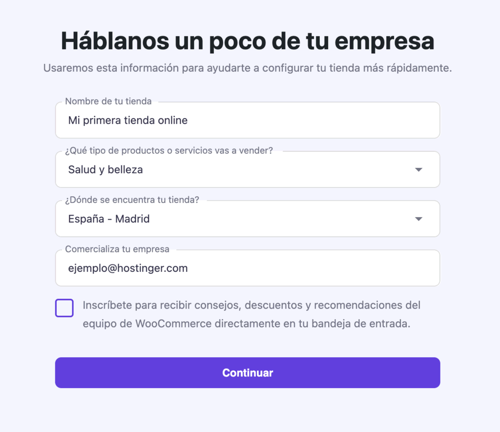 Recuerda introducir los datos correctamente, ya que esta información influirá en tus opciones de impuestos, envío y pasarela de pago. Haz clic en Continuar.