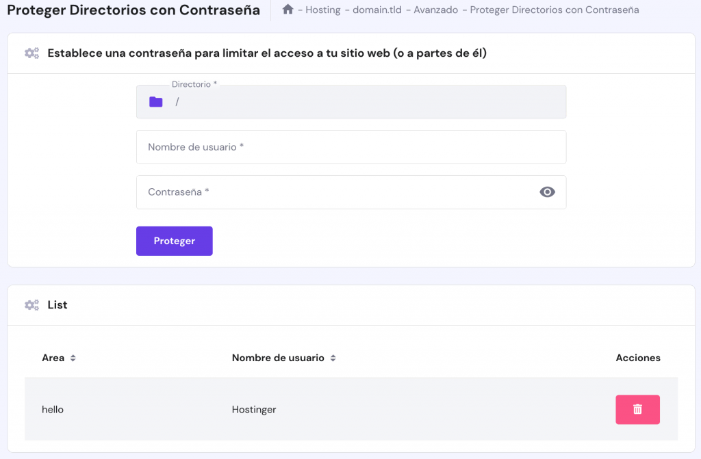 Si eres cliente de Hostinger, puedes proteger tu sitio web con una contraseña utilizando la herramienta de Proteger Directorios con Contraseña de hPanel: