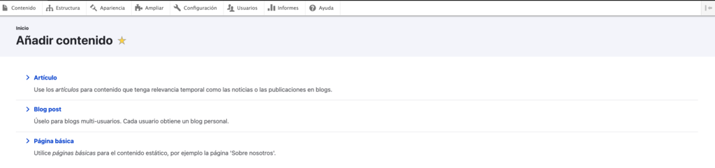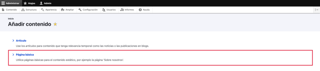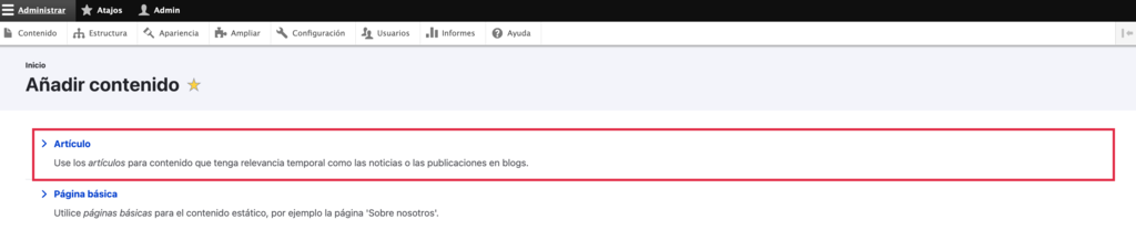 Drupal tiene dos tipos de contenido básicos: artículo y página básica.