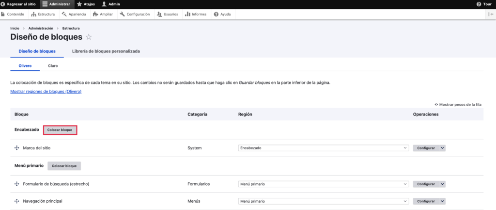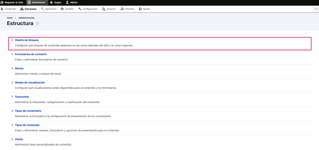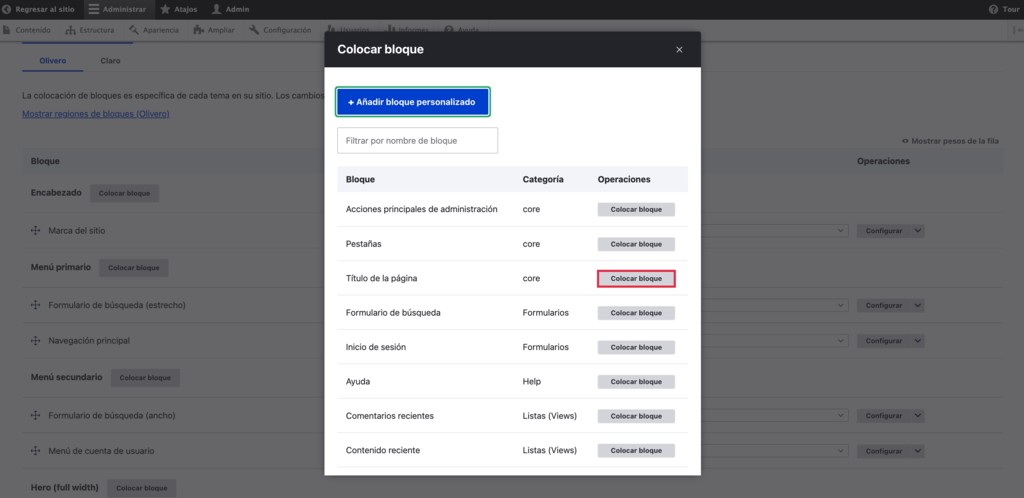 Esta funcionalidad, proporcionada por el módulo central Block, forma parte del núcleo de Drupal 8. Utilízalo con los módulos Custom Block y Place Block para incorporar bloques en cualquier página.