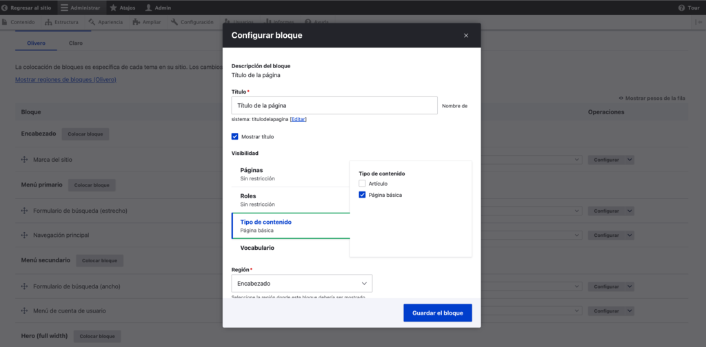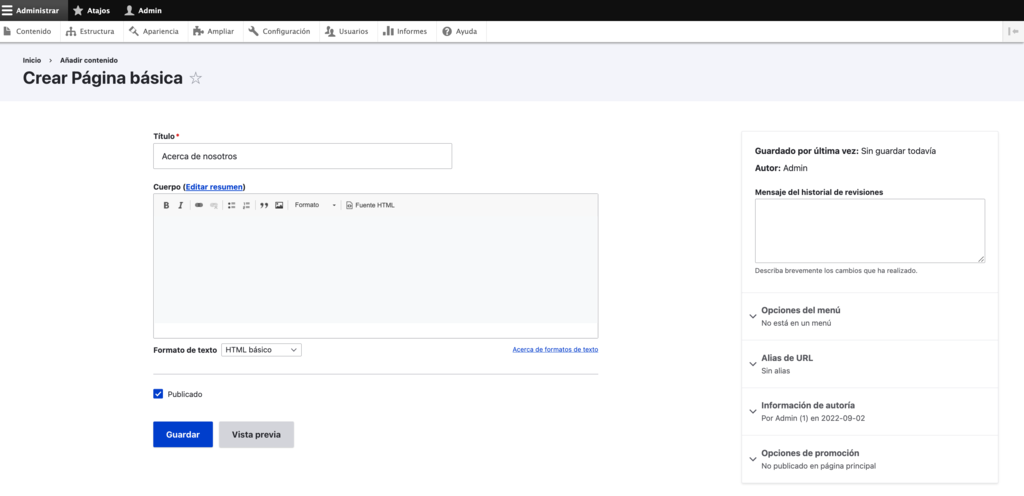 Por su parte, el tipo página básica se emplea para contenidos estáticos que requieren una actualización mínima o nula, como una página Acerca de nosotros. Una página básica no aparece en la página de inicio del sitio y no permite comentarios por defecto.