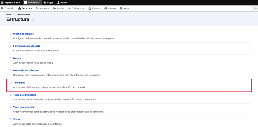 Una taxonomía se utiliza para clasificar el contenido del sitio web. En Drupal, las taxonomías se componen de entidades llamadas términos, que son palabras que describen un contenido específico dentro de los vocabularios. Un vocabulario puede tener una estructura plana o jerárquica según el tipo de contenido.