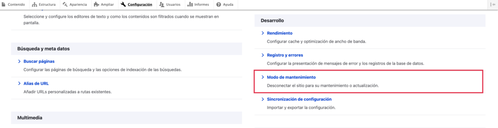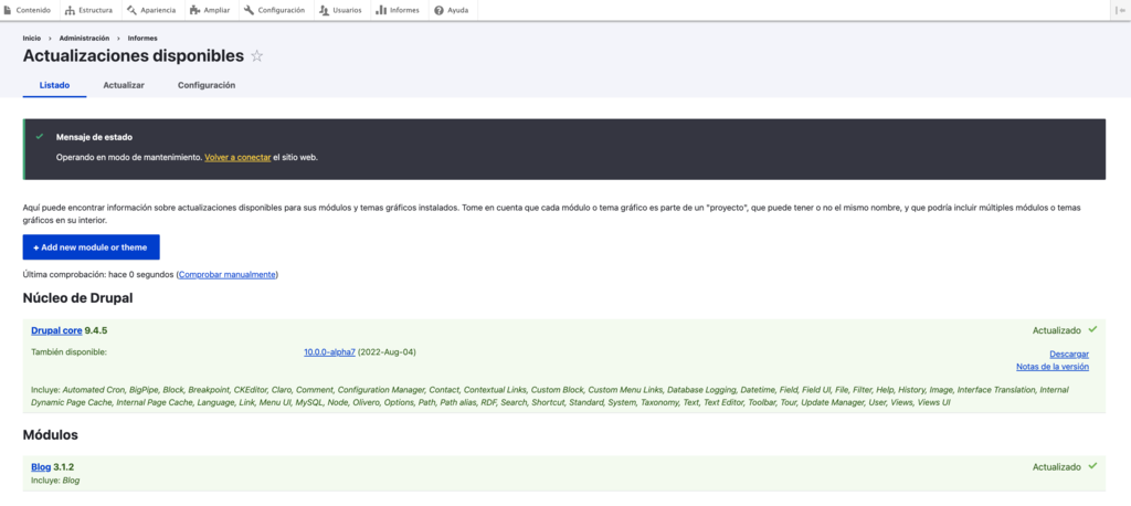 En esta sección, repasaremos los pasos para actualizar Drupal. Antes de empezar, te recomendamos encarecidamente que cambies tu sitio al modo de mantenimiento. Al hacerlo, evitarás que los visitantes accedan al sitio durante el proceso de actualización.